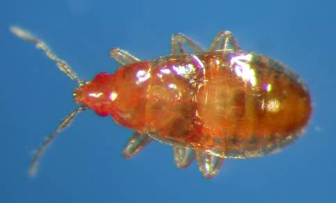 c. 若蟲:體長約2mm,身體扁平,觸角、足呈透明狀,身體其他部位則呈鮮亮的橘紅色。