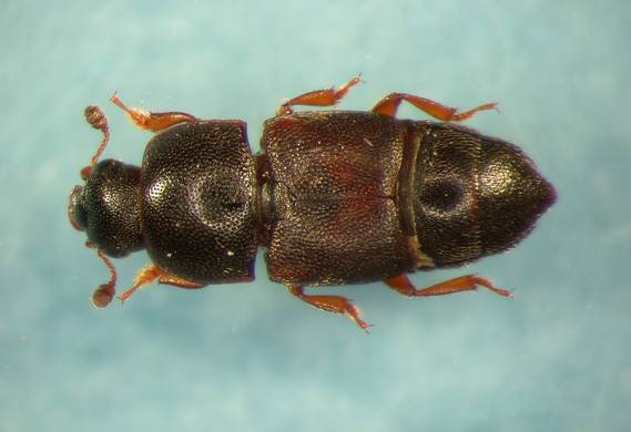 d. 蛹:長約3mm,寬1.2-1.3mm。外形及色澤與與黃斑露尾蟲蛹極相似,其不同點為前胸背板僅具粗刺4對,基部中央1對全缺,基角附近1對全缺或退縮呈剛毛狀。雌雄性的區別和黃斑露尾蟲相同。