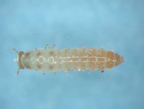 d. 蛹:體長2.5mm,乳白色,腹部背面有縱走赤褐色線1條,複眼黑色,前胸兩側各有6個齒狀凸起,尾端也有1尖狀凸起。