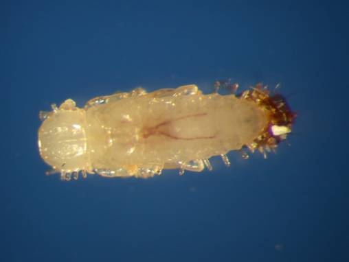 c. 幼蟲:圓筒形,體長3mm頭部、硬皮板及尾節均黃褐色。口器淡赤褐色,胴部細長乳白色,每體節均有兩個稍暗色的斑紋。